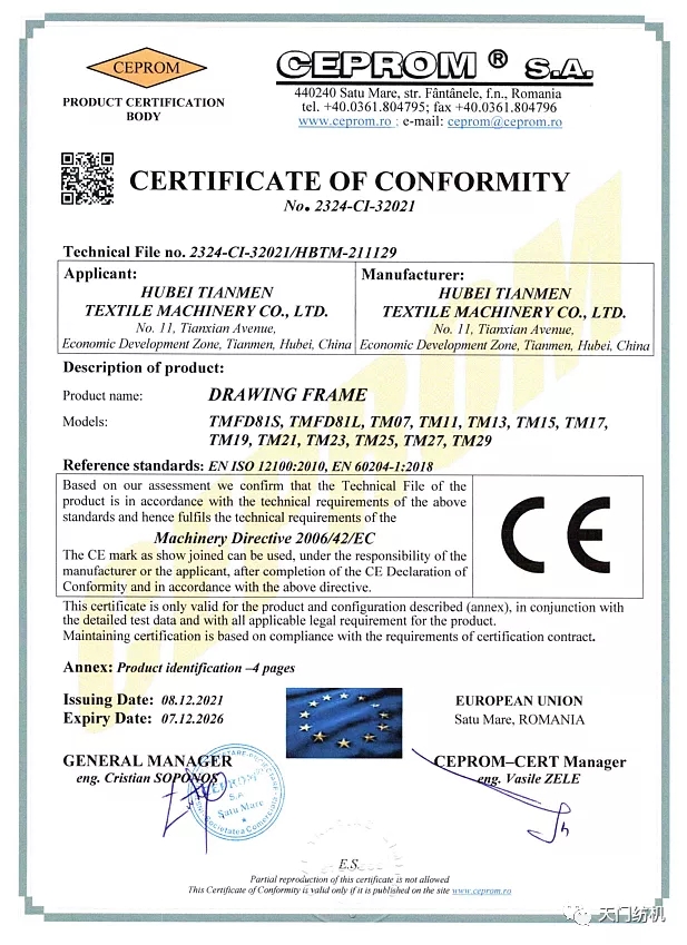 產(chǎn)品得到國際市場認可,天門紡機獲得歐盟“CE”證書